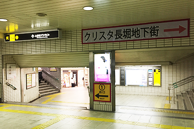 ②地下街「クリスタ長堀」への案内板が見えます。